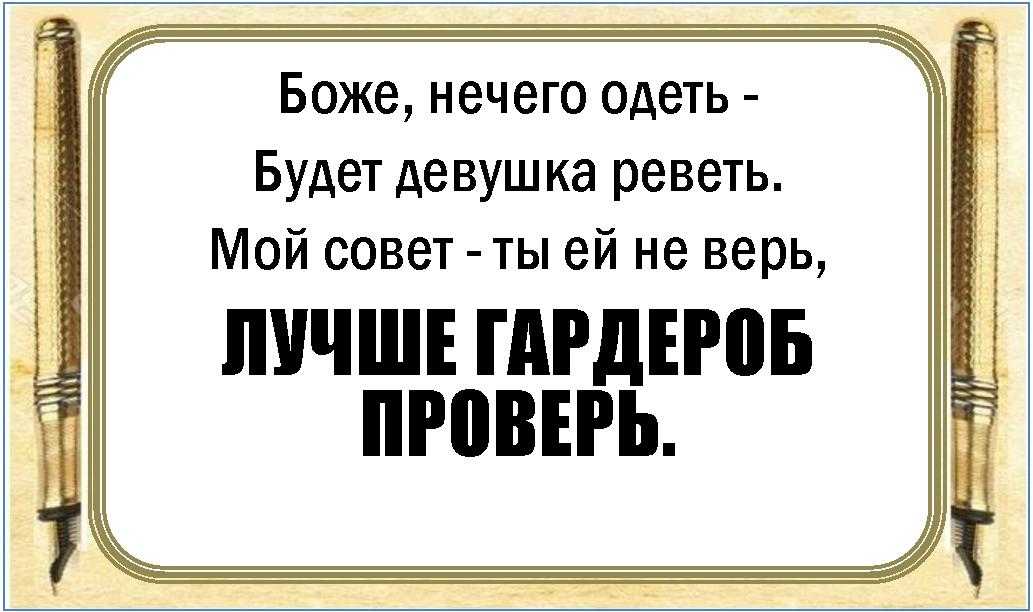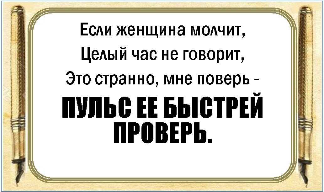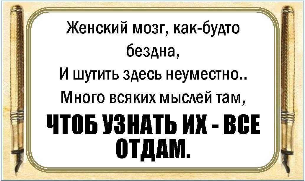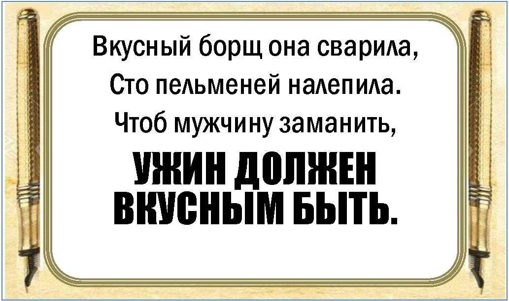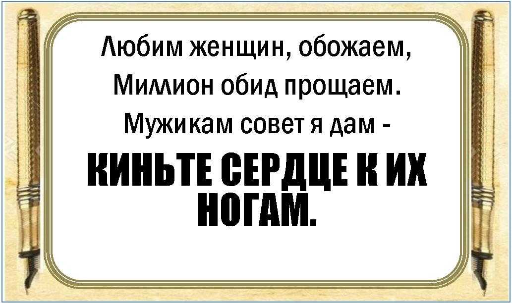 Без женщин в доме нет комфортаИ вкусных жареных котлет.И давит томная дремота,Когда в квартире женщин нет!Без женщин – ни к чему цветеньеБлагоухающих цветов!Без женщин скучно в воскресенье,Без женщин меркнет яркость снов!Без женщин и вино – не в радость!И греть не будет солнца свет!Без женщин – в жизнь придёт усталость…Без женщин – вовсе жизни нет!