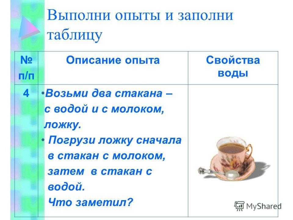 Выполни опыты и заполни таблицу п/п Описание опытаСвойства воды 4Возьми два стакана – с водой и с молоком, ложку. Погрузи ложку сначала в стакан с молоком, затем в стакан с водой. Что заметил?
