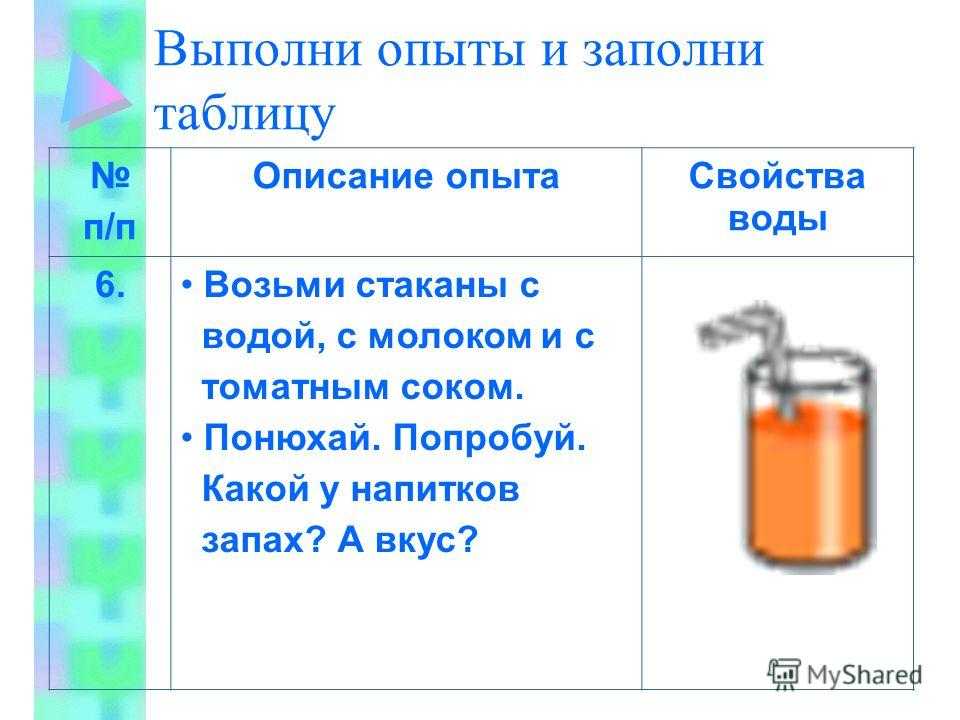 Выполни опыты и заполни таблицу п/п Описание опытаСвойства воды 6. Возьми стаканы с водой, с молоком и с томатным соком. Понюхай. Попробуй. Какой у напитков запах? А вкус?