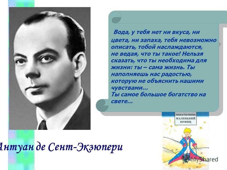 Антуан де Сент-Экзюпери имел богатый жизненный опыт. Во время своих полетов он не раз попадал в авиакатастрофу, поэтому Экзюпери, как никто другой, знал цену жизни и дорожил ею. В своих произведениях автор размышляет о бытии, о любви, о дружбе, о войне и пр. Он учит выделять настоящие ценности, дорожить преданностью, доверием и искренностью близких людей. Книги Экзюпери – это источник, откуда можно бесконечно черпать мудрые мысли.