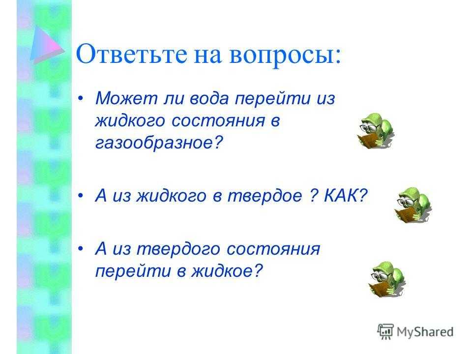 Ответьте на вопросы: Может ли вода перейти из жидкого состояния в газообразное? А из жидкого в твердое ? КАК? А из твердого состояния перейти в жидкое?