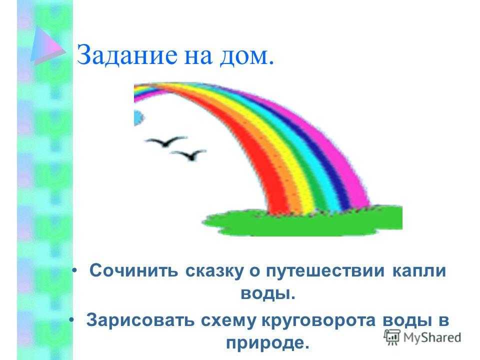Задание на дом. Сочинить сказку о путешествии капли воды. Зарисовать схему круговорота воды в природе.
