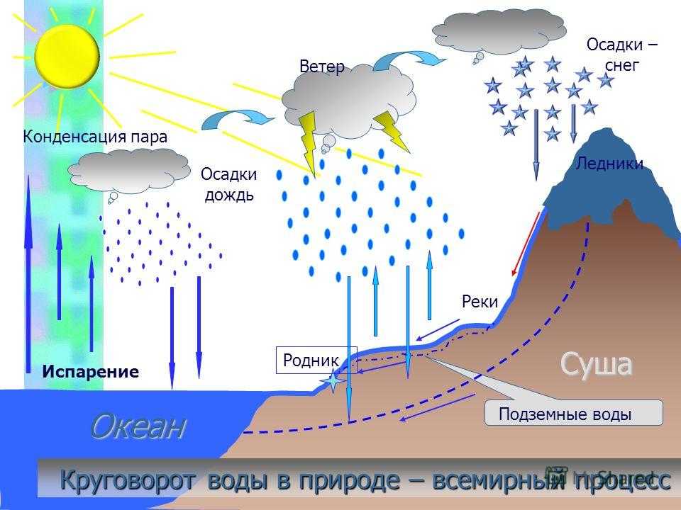 Испарение Конденсация пара Осадки дождь Осадки – снег Ветер Круговорот воды в природе – всемирный процесс Подземные воды Ледники Родник Реки Океан Суша