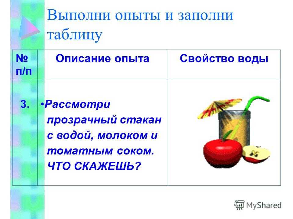 Выполни опыты и заполни таблицу п/п Описание опытаСвойство воды 1. Налейте воду в прозрачный прямоугольный стакан Налейте воду в прозрачную круглую банку Налейте воду в овальную прозрачную вазу