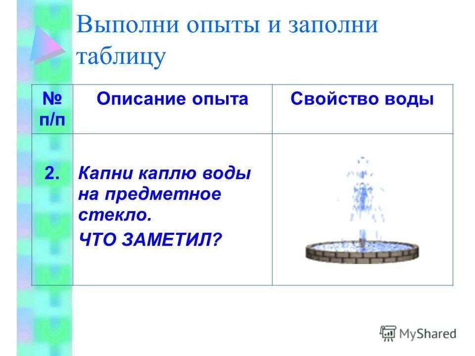 Выполни опыты и заполни таблицу п/п Описание опытаСвойство воды 2.Капни каплю воды на предметное стекло. ЧТО ЗАМЕТИЛ?