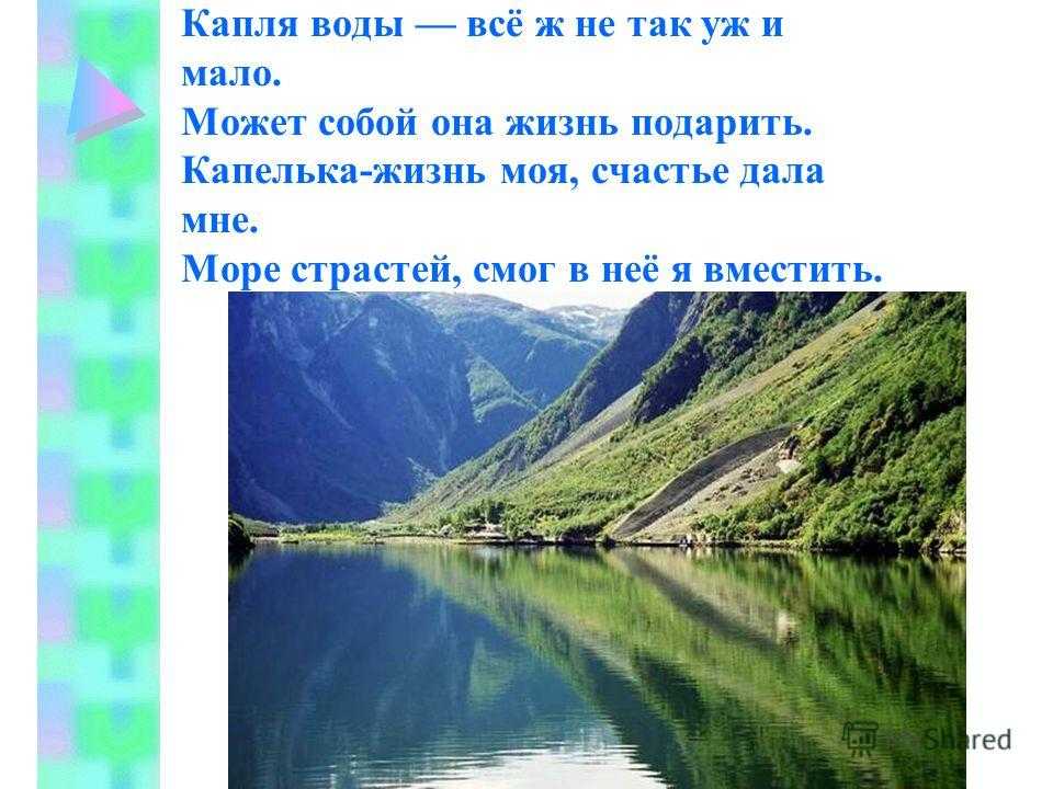 Капля воды всё ж не так уж и мало. Может собой она жизнь подарить. Капелька-жизнь моя, счастье дала мне. Море страстей, смог в неё я вместить.