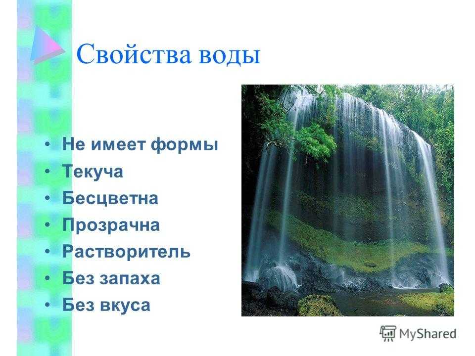 Свойства воды Не имеет формы Текуча Бесцветна Прозрачна Растворитель Без запаха Без вкуса