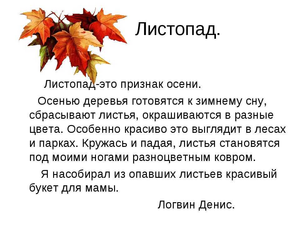 Мне очень нравится осень, потому что листья начинают желтеть и падать, земля становится уже не такой серой, а принимает яркие краски. Очень приятно идти по таким цветным листьям и представлять, будто ты в волшебной сказке.