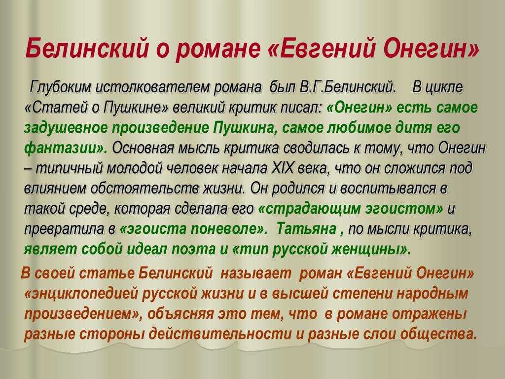 В своих суждениях о главном персонаже «Героя нашего времени», Печорине, Белинский сравнивает его с не менее известным пушкинским героем Евгением Онегиным. Он сопоставляет этих двух личностей между собой. И хоть эти два романа пронизаны одной идеей — показать истинную прозу жизни, их герои кардинально отличаются друг от друга. Именно Печорина критик считает настоящим «героем нашего времени». Белинский хоть и критикует главного героя за его нелицеприятные поступки, но все же видит в нем человека, который в своем образе олицетворяет проблемы нынешнего, на тот момент, общества. Хотя эти проблемы остаются актуальными и по сей день. Печорин понимает свою проблему, пытается найти ей решение, борется со своими демонами. Он не хочет принимать жизнь такой, какая она есть, так, как все остальные. В нем было много сил, энергии и умений, которые он растрачивал зря, всячески пытаясь найти им применение. Именно за это Белинский высоко оценивал Печорина, в отличии от других критиков.