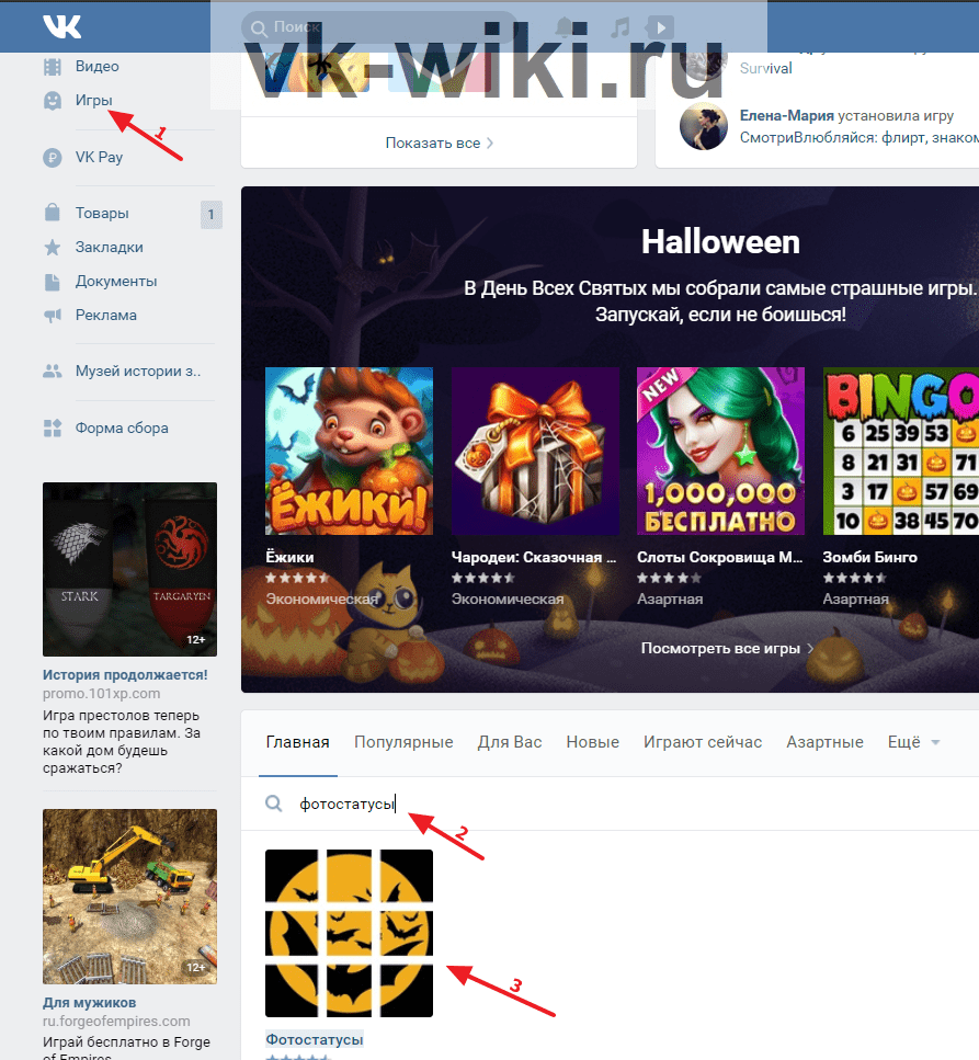 На самом деле, такие фотостатусы можно устанавливать и самостоятельно, но для этого понадобится умение работы в фоторедакторах (например, в Photoshop). В этой же статье мы расскажем о более простом методе, который доступен всем пользователям, но применить его можно будет только в полной компьютерной версии сайта, так как только здесь доступны соответствующие приложения. Таким образом, сначала через левое главное меню на сайте нужно перейти в раздел с «Играми». Далее на открывшейся странице нужно написать слово «фотостатусы» в поисковой строке, чтобы в итоге в поисковой выдаче найти нужное приложение. Далее на него требуется просто нажать и запустить.