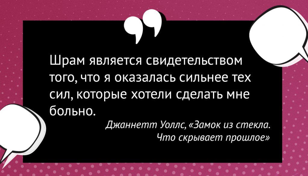 Шрам является свидетельством того, что я оказалась сильнее тех сил, которые хотели сделать мне больно. — Джаннетт Уоллс, «Замок из стекла. Что скрывает прошлое»