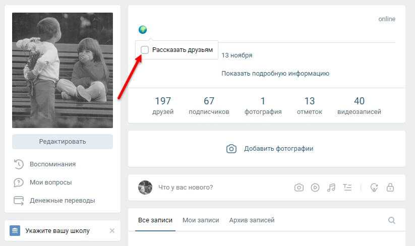 После смены статуса «ВКонтакте» разрешает поделиться новостью с аудиторией, добавив галочку напротив пункта «Рассказать друзьям». Специальное текстовое сообщение, подтверждающее добавление новой информации в профиль, появится на личной странице и продублируется в ленту.