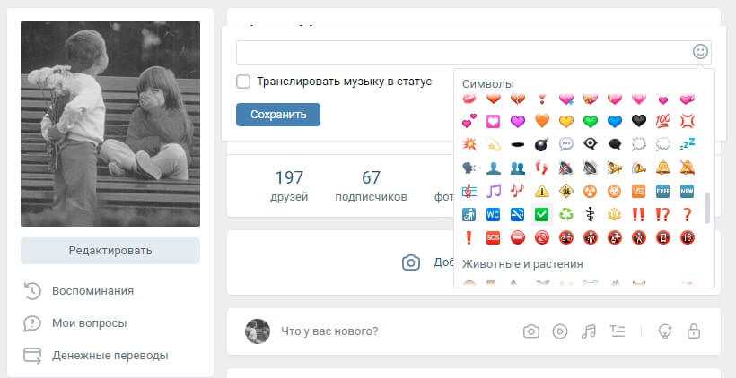 Альтернатива текстовым сообщениям, закрепленным в статусе, – эмодзи, выбираемые из выпадающего списка с категориями и дополнительными символами. Выбор смайликов обширный – разноцветные сердечки, знаки, животные, флаги стран и организаций. Как и в случае с текстом, статус вмещает до 140 эмодзи, выстроенных в ряд и неразделенных пробелами или дополнительными символами.
