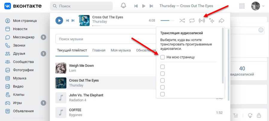 А во-вторых, запустив медиаплеер и воспользовавшись функцией «Трансляция аудиозаписей». Второй вариант слегка предпочтительнее – появится шанс кроме передачи информации на личную страницу еще и дополнить подробностями сообщества.