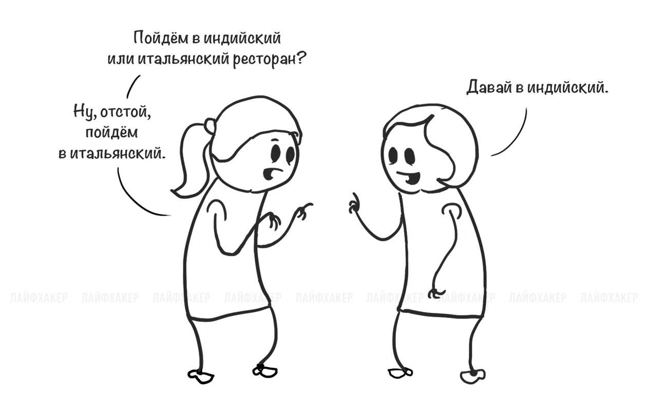 Ещё одна проверка на вшивость — выяснить, кто определяет настроение в компании. Допустим, друзья встречаются, но у них разный настрой. Рано или поздно настроение приходит к общему знаменателю. Чьё состояние обычно побеждает? Например, Саша не в духе, Женя, наоборот, на подъёме, а Валя подстраивается под Сашу и скучает, пока Саша не начнёт веселиться