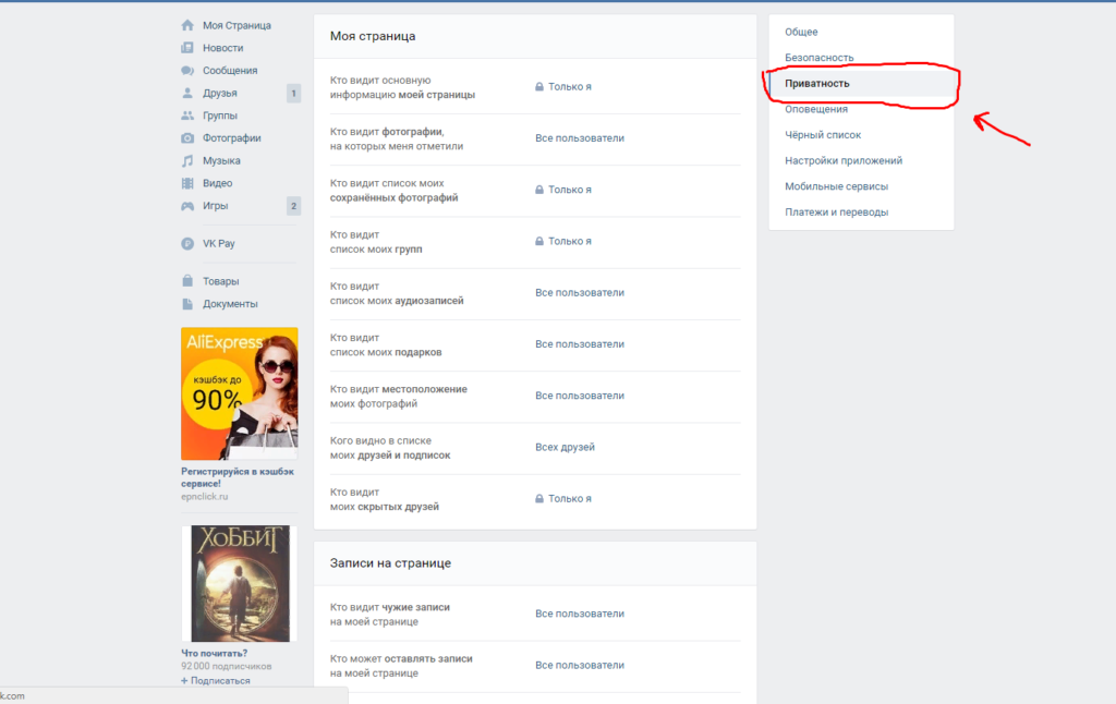 Весь алгоритм таков: стрелочка в правом верхнем углу – «настройки» – «приватность».