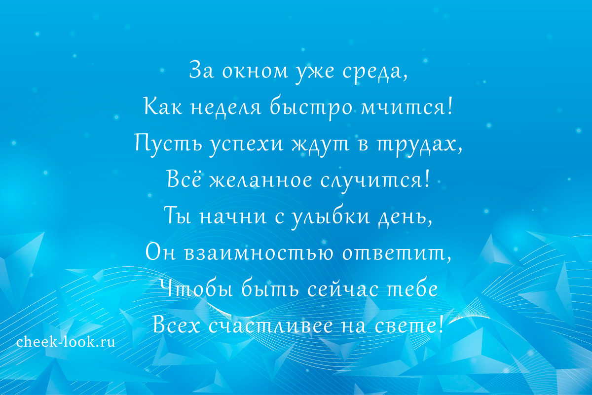 Примите самые искренние поздравления с этой замечательной средой! Даже если это не день отдыха, посмотрим правде в глаза – время летит так быстро, дни проходят как в тумане, без отдыха! Проведи этот прекрасный день по максимуму, он обещает быть наполненным мега азартом. Пусть атмосфера вокруг вас вдохнет жизнь в ваш день!