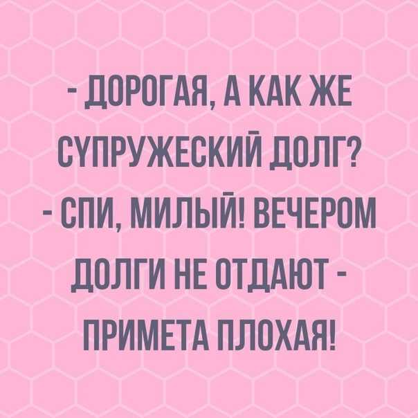 Вечер, супруги в постели. Муж отворачивается от жены и готовится спать. Жена: — Дорогой, а как же супружеский долг? Может у тебя свидание с любовницей или секретная встреча?