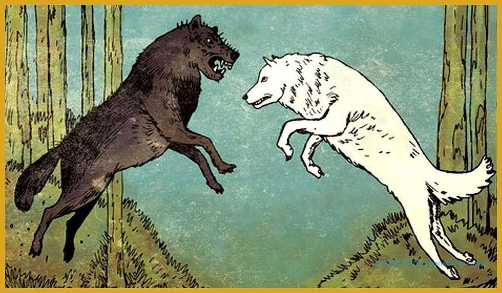 «-В каждом человеке идёт борьба, похожая на борьбу двух волков, -учил внука дед. -Один волк представляет зло: зависть, ложь и гордыню. За другим волком-добро: мир, истина и любовь. -И какой волк побеждает? – спросил деда внук. -Побеждает тот, которого ты кормишь, — сказал старик.»
