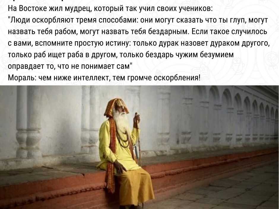 Один падишах прислал мудрецу три одинаковые бронзовые статуэтки и велел передать: – Пусть решит, кто из троих людей, чьи изваяния мы посылаем, достойный, кто так себе и кто низкий. Никто не мог найти никакой разницы между тремя статуэтками. Но мудрец заметил дырочки в ушах. Он взял тонкую гибкую палочку и воткнул её в ухо первой статуэтки. Палочка вышла через рот. У второй статуэтки палочка вышла через другое ухо. У третьей статуэтки палочка застряла где-то внутри. – Человек, который разглашает всё, что услышит, – безусловно, низок, – рассудил мудрец. – Тот, у кого тайна входит в одно ухо, а выходит через другое – человек так себе. Истинно же благороден же тот, кто хранит в себе все тайны. Так решил мудрец и сделал соответствующие надписи на всех статуэтках.